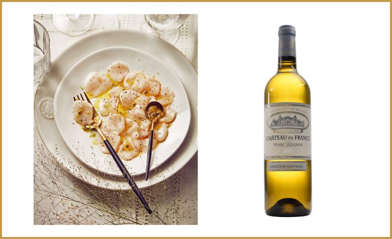 White Château de France displays a lovely bouquet of white fruit, citrus and buttery notes on the nose. Its roundness and liveliness go beautifully with the sweetness of scallops. The acidity of this balsamic vinegar, known to be the oldest and most authentic in the world, and the fruitiness of olive oil elevate the pairing to perfection.